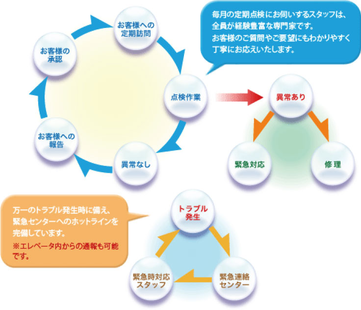 平均的には毎月、専門の技術員がエレベーターの動き(音、振動、汚れ、機嫌他)を肌で確認し、それぞれのエレベーターに対し適切な対応を行い、長く安全性が維持できるよう保守管理を行います。