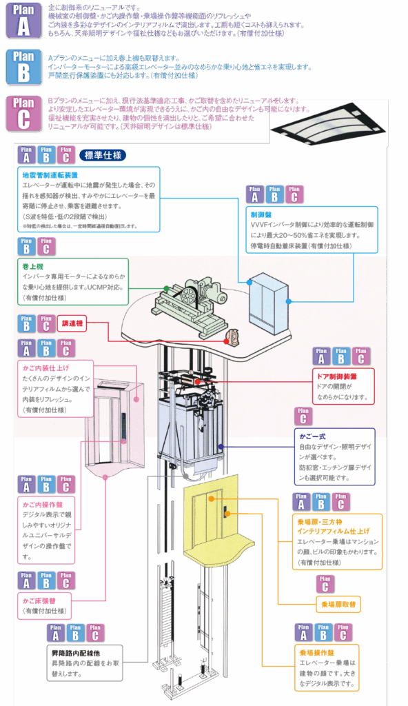 リニューアルプランは、予算や経年を考慮し、お客様に最適のプランをご提案します。 建物のイメージに合わせ天井の形状や壁の色、床の素材からオプション装備まで、オリジナルなエレベーターづくりが可能です。 もちろん、当社専門スタッフがおすすめのコーディネートするパッケージもございます。